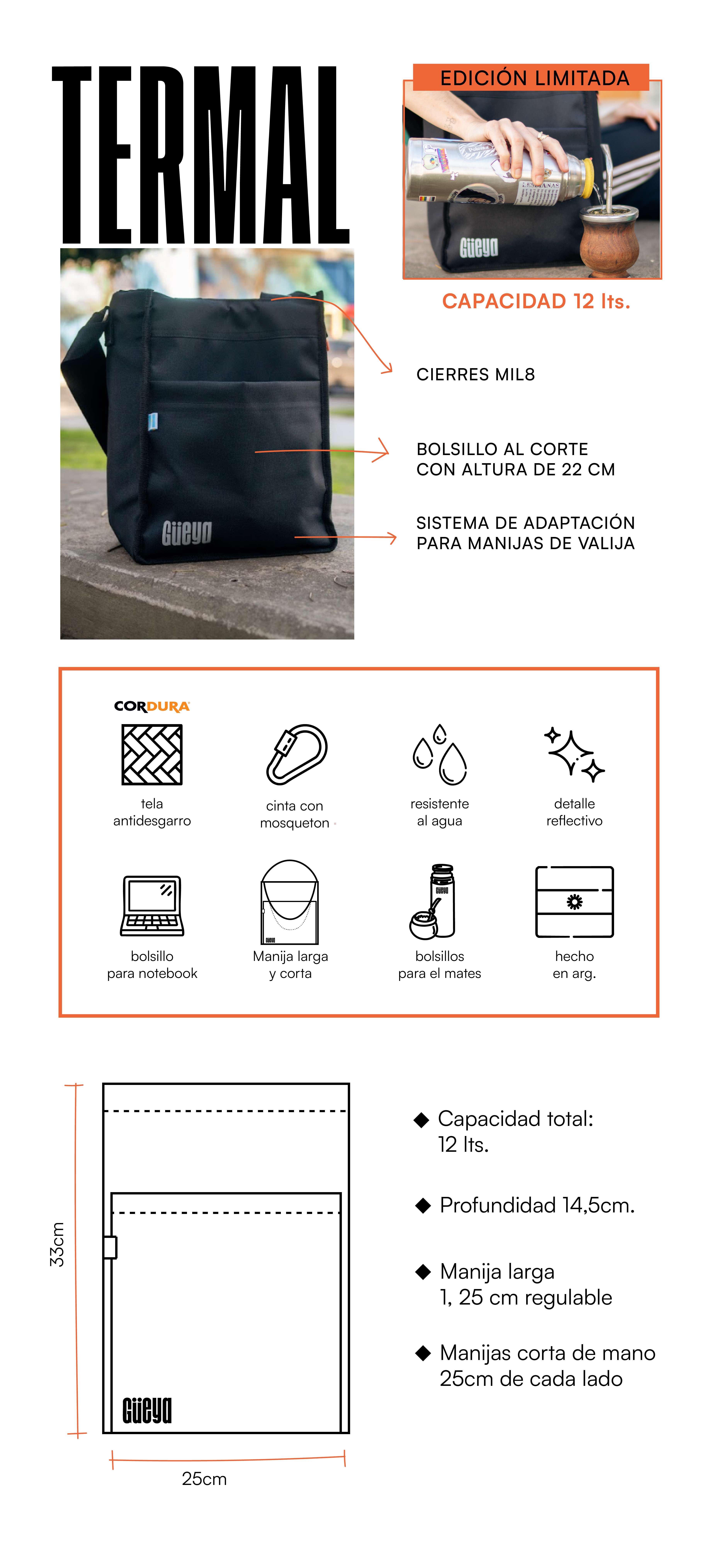 Con 12 L de capacidad, TERMAL guarda todo lo que necesitás para el día: tu termo, notebook y objetos importantes, siempre organizados. Con bolsillo al corte, gancho lateral y cinta con mosquetón, todo está seguro y a mano.